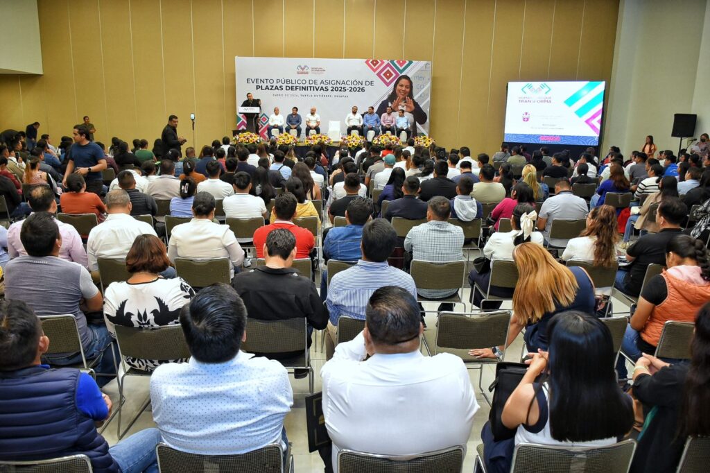 El evento coordinado por Sistema para la Carrera de las Maestras y los Maestros en Chiapas (COSICAM), realizó la entrega de 202 plazas distribuidas en los niveles de educación Preescolar Indígena (60) y educación Primaria Indígena (142), garantizando procesos claros, equitativos y con apego a la normatividad vigente.